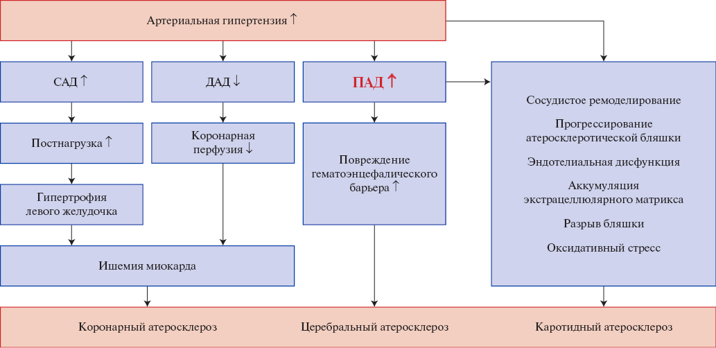 Как отмечалось ранее, существует тесная связь между высоким ПАД, жесткой сосудистой стенкой, развитием ИСАГ и возрастающим риском ССО, которая наглядно представлена на рисунке 2 [18]. В частности, установлено, что повышение ПАД у пациентов с АГ существенно увеличивает риск фибрилляции предсердий, инсульта, ишемической болезни сердца, застойной сердечной недостаточности, прогрессирования хронической болезни почек [19].