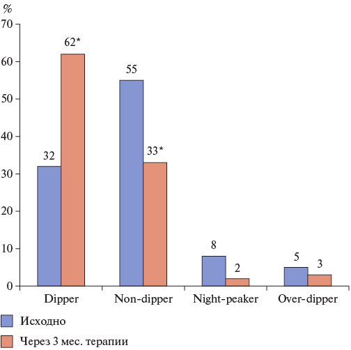 Рис. 1. Распределение пациентов по типам суточного профиля исходно и на фоне 3-месячной АГТ ФК амлодипина и индапамида.