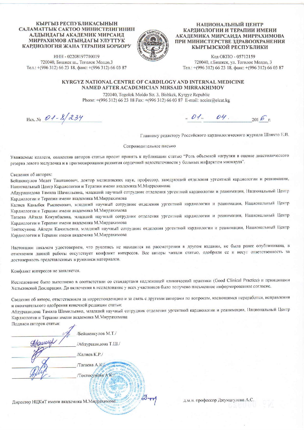 Beyshenkulov M.T., Abdurashidova T.Sh., Kaliev K.R., Toktosunova A.K., Tagaeva A.K. PLACE OF VOLUMETRIC LOAD IN ASSESSMENT OF DIASTOLIC RESERVE OF THE LEFT VENTRICLE AND IN PREDICTION OF HEART FAILURE DEVELOPMENT FOR MYOCARDIAL INFARCTION PATIENTS. Russian Journal of Cardiology. 2016;(8):31-35. (In Russ.) https://doi.org/10.15829/1560-4071-2016-8-31-35