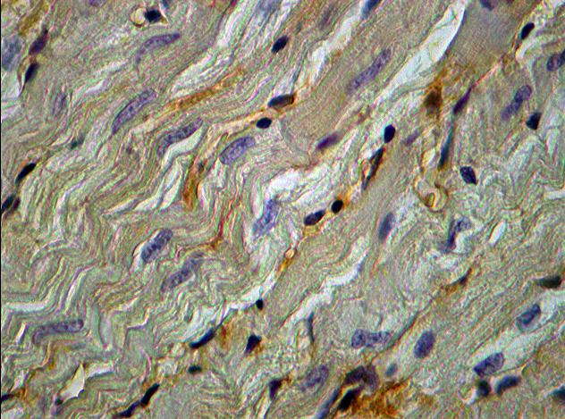 3. Рис. 3 Фрагмент миокарда ЛЖ крысы на 14 сут после моделирования ЭСН. Окраска: иммуноцитохимическая пероксидазная реакция для выявления ММП-2. Ув. об. 40, ок. 10 ММП-2-позитивные кардиомиоциты. | |